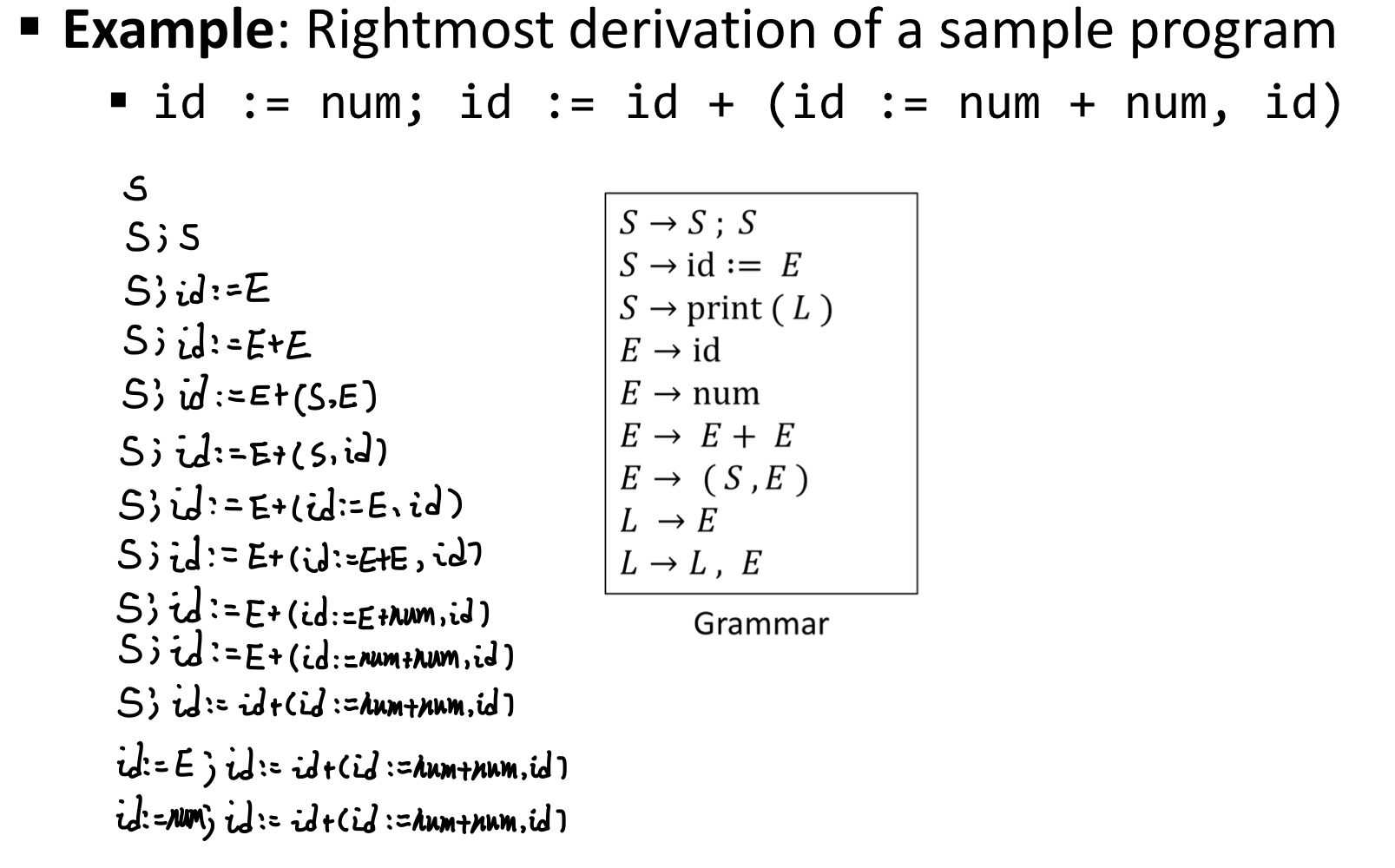 - Rightmost Derivation: rightmost nonterminal 교체 in each step