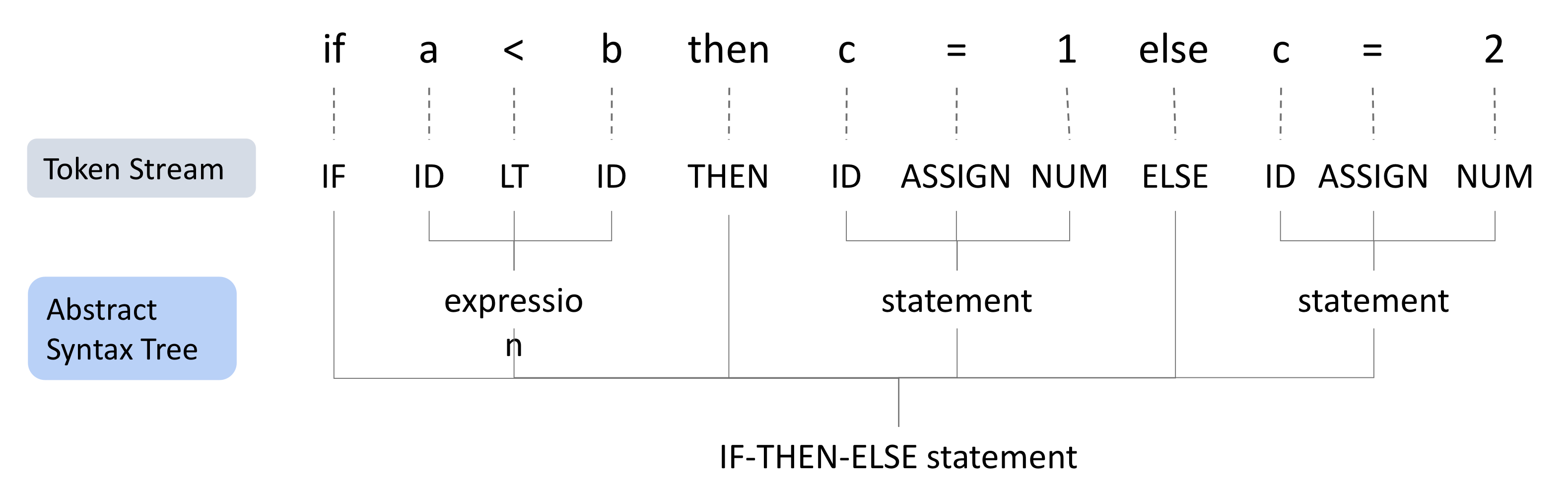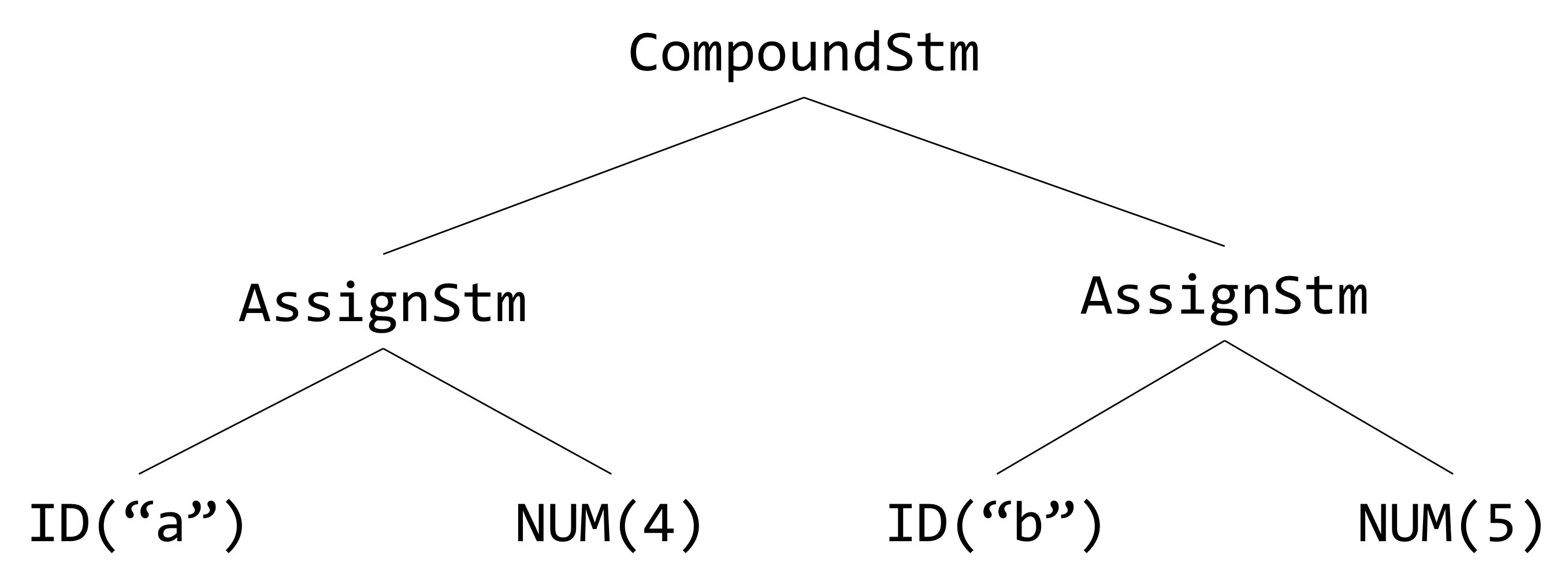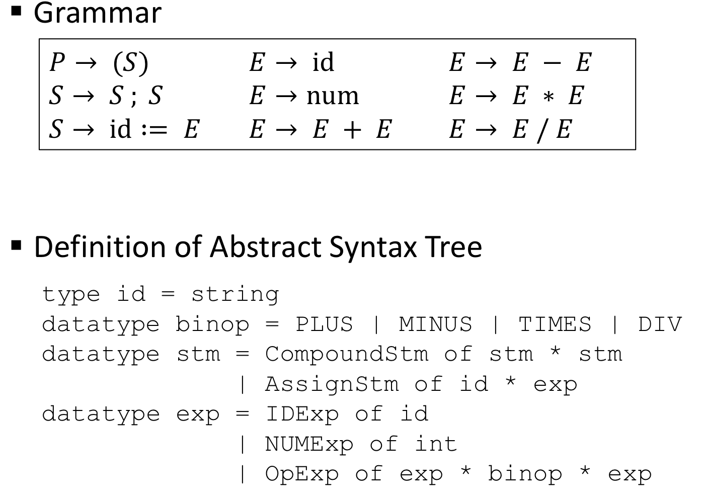 - Abstract Syntax Tree(Abstract Parse Tree): concrete parse tree에서 불필요한 토큰 제거