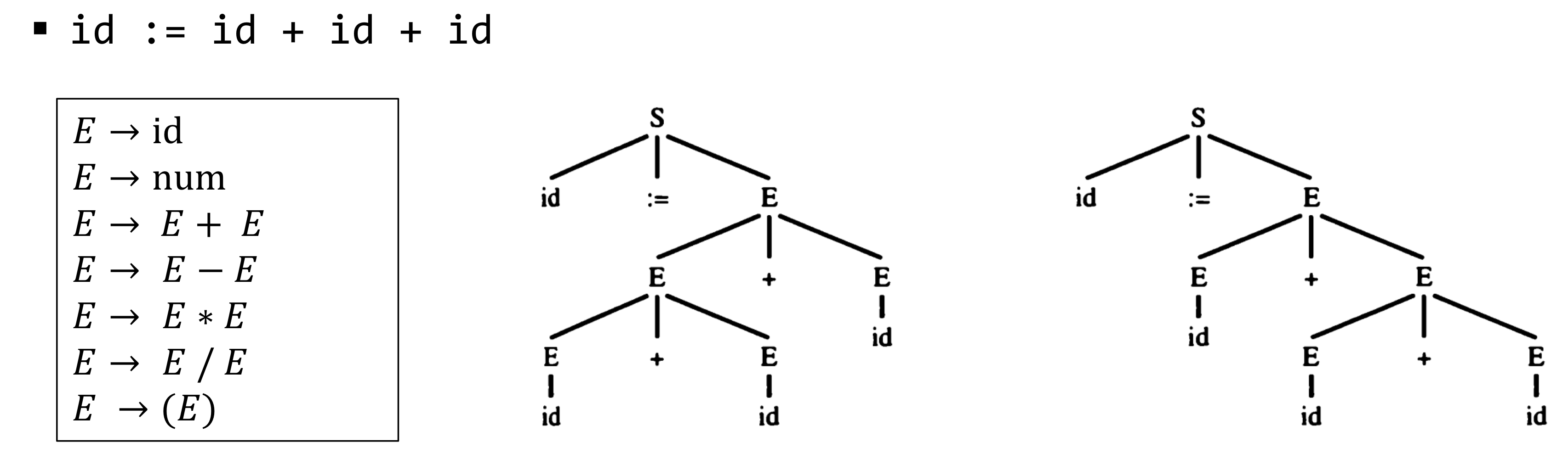 - 같은 프로그램을 2개 이상의 parsing trees로 유도 가능 -> A grammar is ambiguous