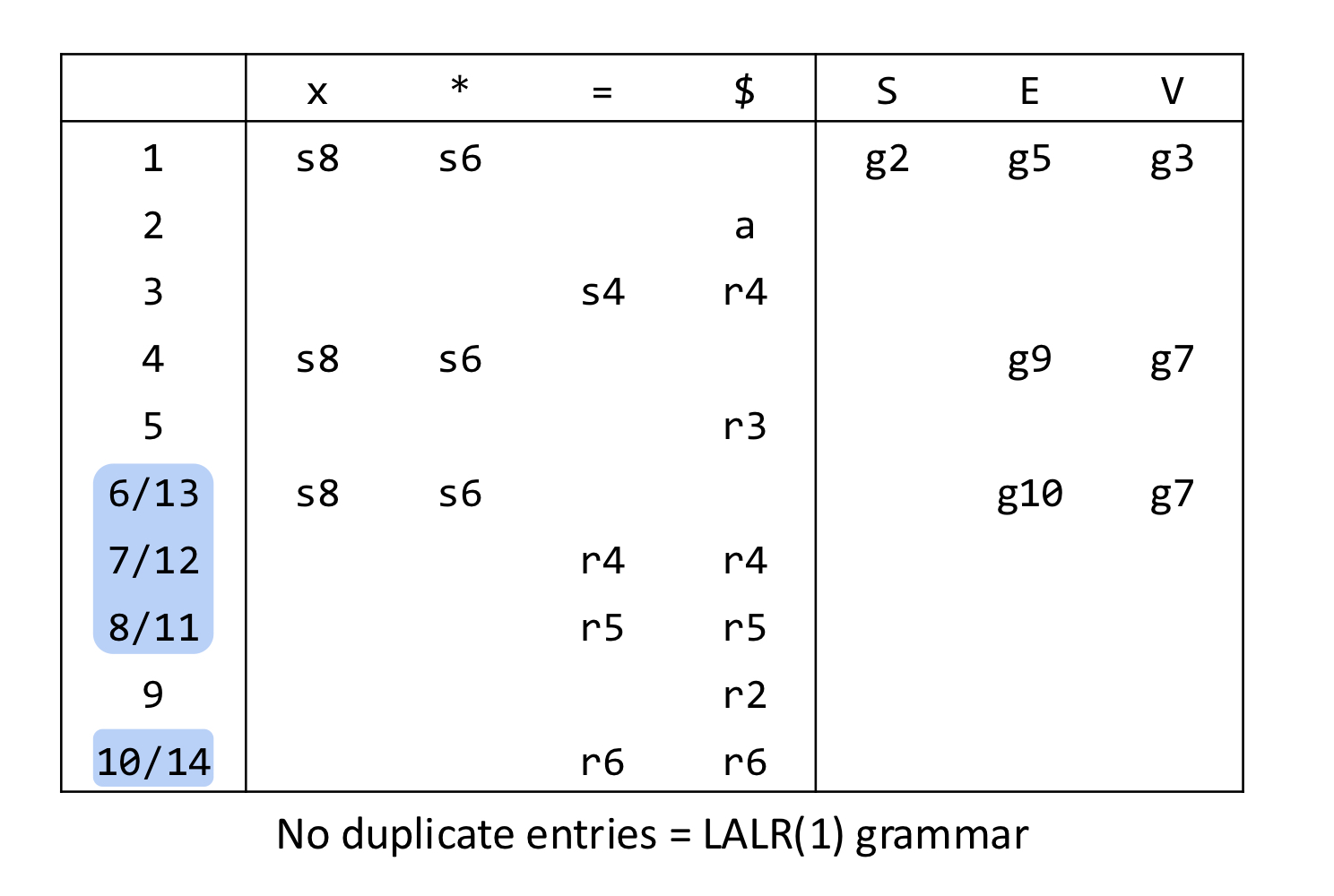 - production이 같은데, lookahead symbol이 다른 경우를 merge