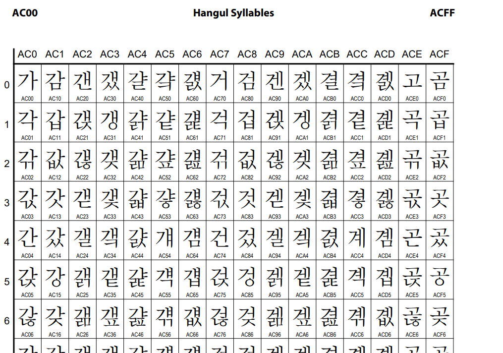 - 완성형 인코딩 : 초성, 중성, 종성의 조합으로 이루어진 완성된 하나의 글자에 고유한 코드를 부여하는 인코딩 방식
